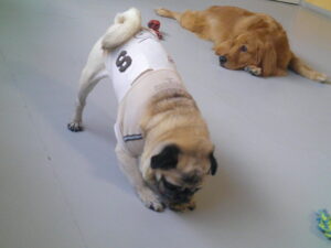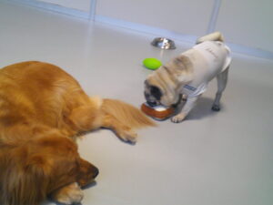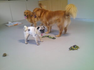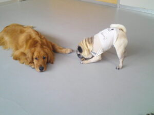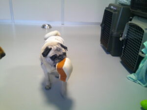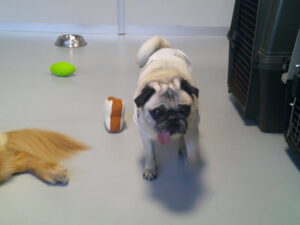 パグのマロニーちゃん、大好きなデンタルボールやフワフワしたパンのおもちゃを 嚙んだり追いかけたりと夢中(^^♪ いつもマイペースです♪ マロニーちゃん、ひとしきり遊んでから、『あ~、ルーナナヌーと一緒に居たっけ!』