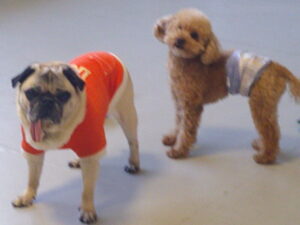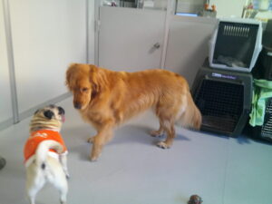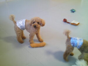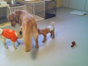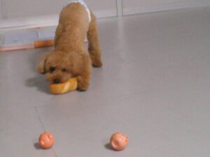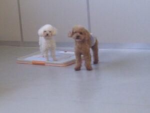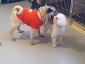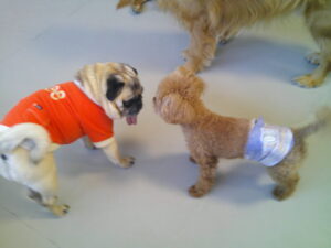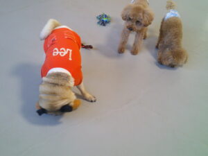 パグのマロニーちゃん、お泊まり中のトイプードルのココアちゃん、ショコラちゃん、モカちゃん♪ マロニーちゃんはモカちゃんに興味津々♡ ショコラちゃんはマロニーちゃんに興味津々♡ ココアちゃんは、今夢中のふあふあパンをマロニーちゃんに取られてしまったけど・・💦 ルーナナヌーも入って皆で仲良く遊びました(^^♪